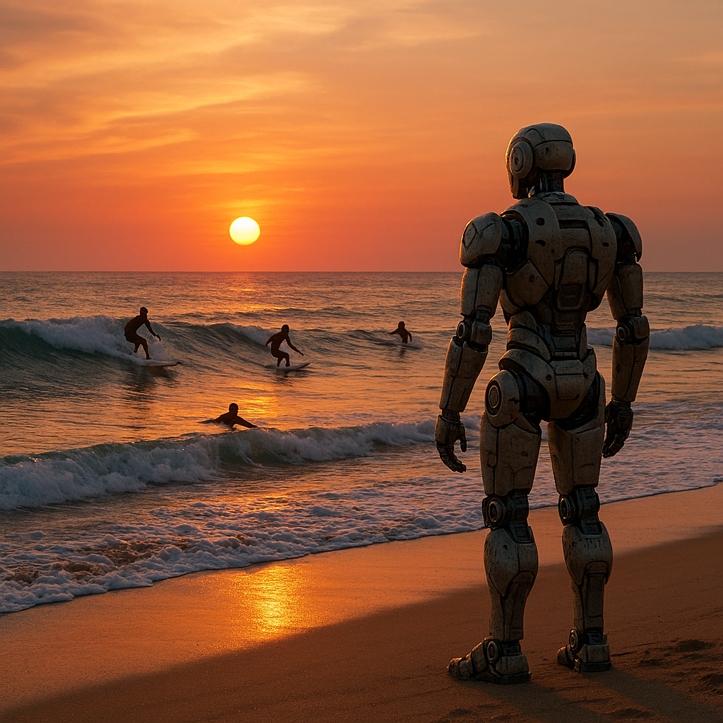 Sunset Surf Robot Tee - Beach Sunset Graphic T-Shirt